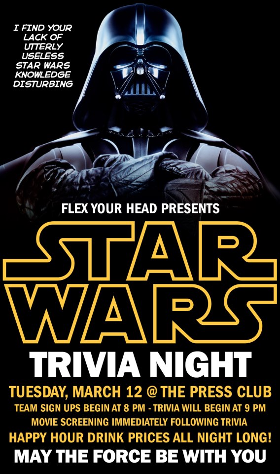 Tonights Flex Your Head is Star Wars themed. Sign ups at 8, game starts at 9. We will see you there!