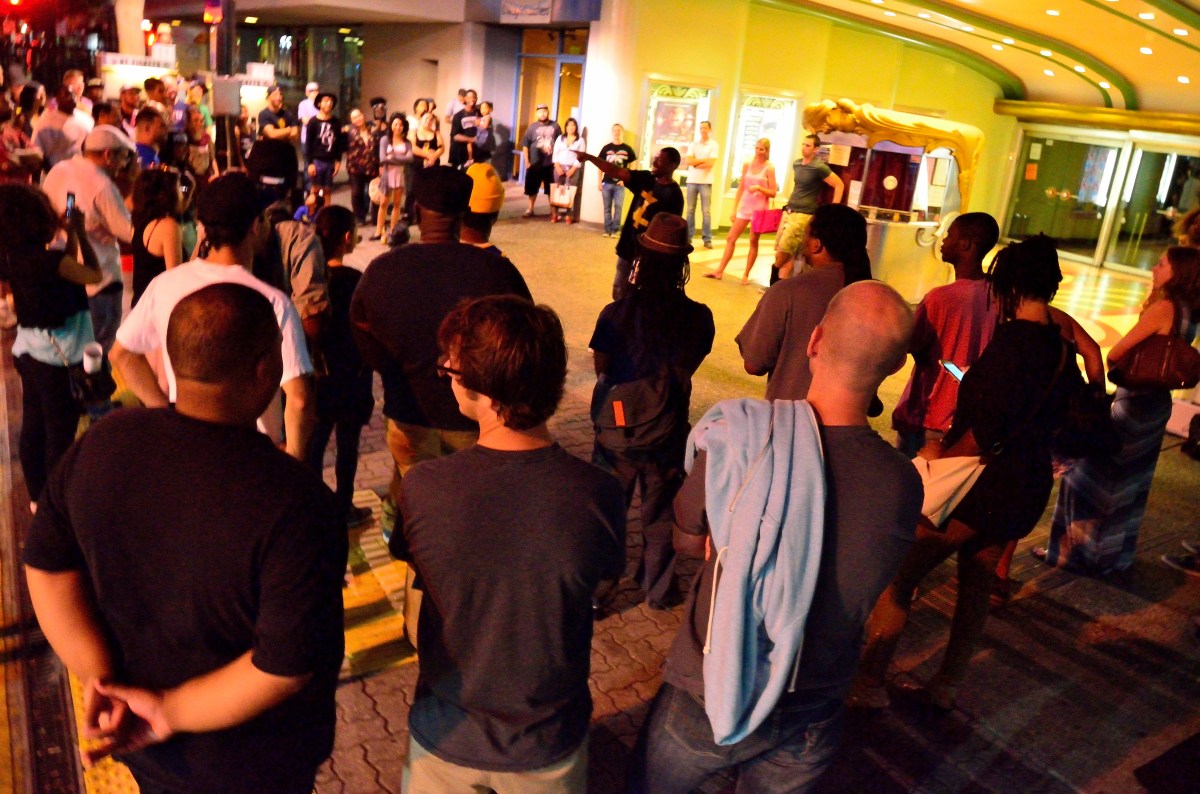 TUBE Magazine_Alexander Amaya_ZFG_9 Published February 8, 2015 at 4928 × 3264 in The Enlightening Efforts of the ZFG Collective. ← Previous Next → Packed crowds — Russell Cummings, poet and comedian, has the crowd laughing as his alter ego The Chocolate Jester. Photo: Alexander Amaya