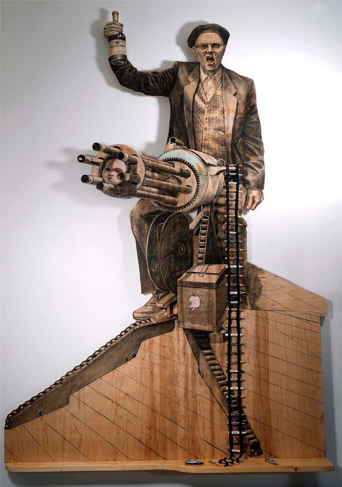 DeniseStewartSanabria_RidingtheBigGun_S_WEB Published February 19, 2015 at 703 × 1000 in What Are We Really Looking At?: The Work of Denise Stewart-Sanabria ← Previous Next → Riding the Big Gun charcoal and pastel on plywood, ceramic, twill tape, pigment print on paper 4’W x 6’H x 5”D Denise Stewart-Sanabria
