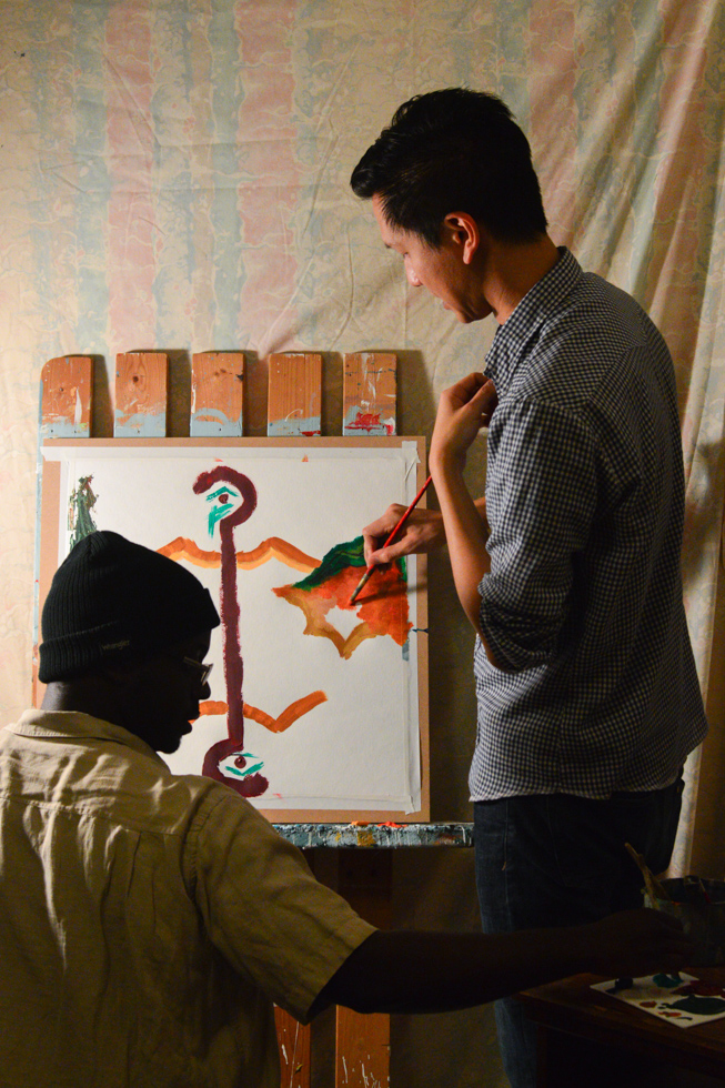 TUBE Magazine_2015_Alejandro Montaño_ Jim Shepard 1 Published March 23, 2015 at 653 × 980 in A Man Under Construction: The Work and Community Outreach of Jim Shepherd Next → Darryl Lewis and Jim Shepherd beginning on a piece during a paint party.