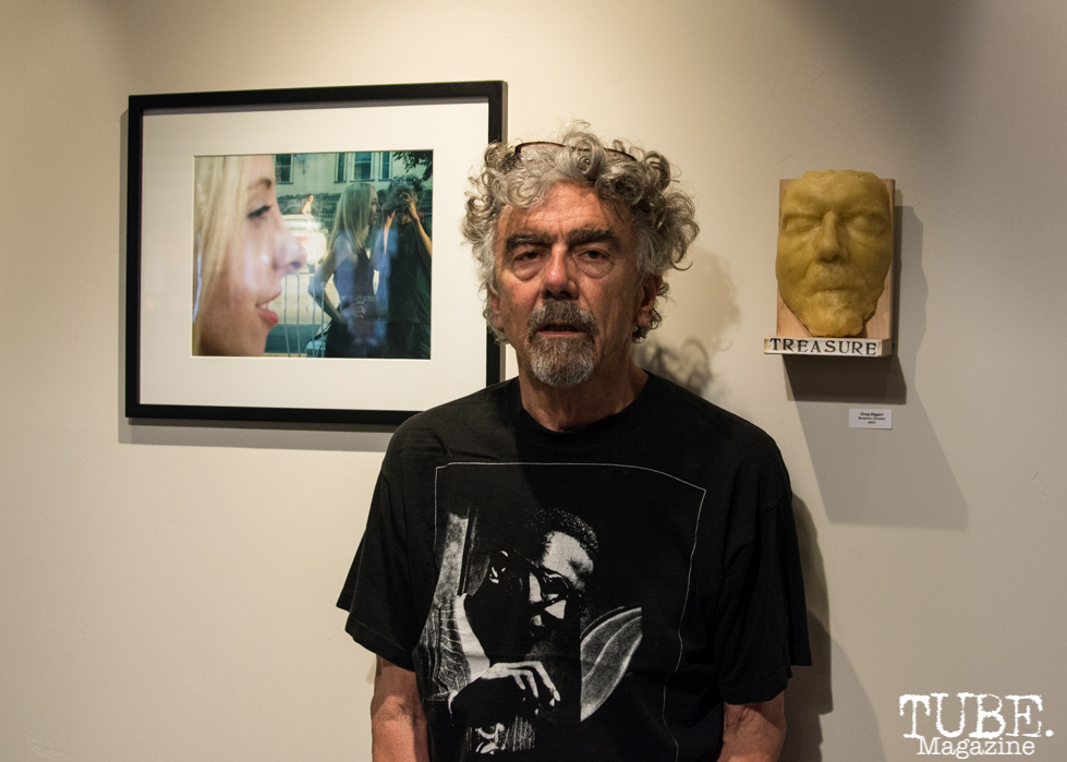 Doug Biggert between his piece, “Melissa Arendt” and the by piece made of him. Photo: Sarah Elliott.