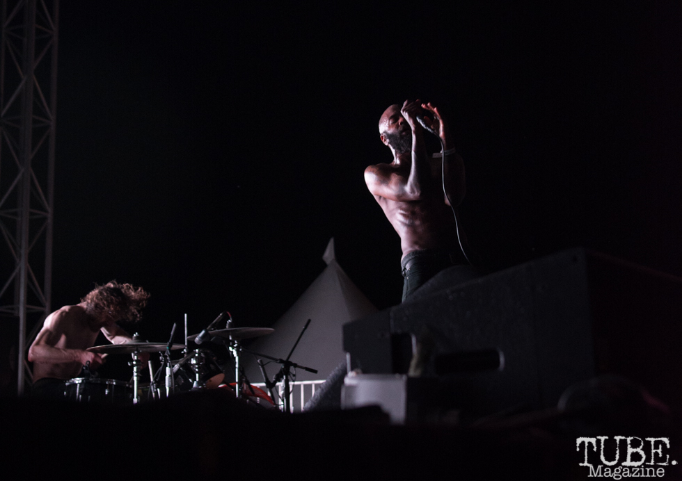 On September 18, at TBD Fest, near the confluence of the two rivers of Sacramento CA, Death Grips came back to their hometown and offered up a roaring reckoning. Despite a quick sound check, MC Ride (vocals, magnetism) Zach Hill (drums, fury) and Andy Morin (keyboards, dark and ancient knowledge) sauntered onto the stage without a word. After briefly hyping up the crowd, MC Ride rockets into a screaming whirlwind of kaleidoscopic vocals which did not let up for a solid hour.