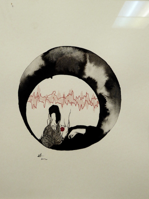 Upon first entering 2500 Minutes at Outlet Coworking in Sacramento, each of the 50 illustrations seems fairly similar to one another. They are all rendered on a small scale, feature similar line qualities, and share the same color palette. Yet, upon closer inspection, each is incredibly personal and includes surprising, dark, or intimate details. In one drawing, labeled 50 Minutes, a woman wears a red pencil skirt, a black strappy bra, and stands with her hands raised behind her head. One of her wrists is injured, yet she stands strong and erect. In another, a woman lies on her back with her face obscured by her flowing mass of hair. One hand rests across her forehead, possibly shielding sun from her eyes, and the other rests on her shoulder. Her clothes are minimally rendered with a single black form, which blends into an inky, atmospheric circle.