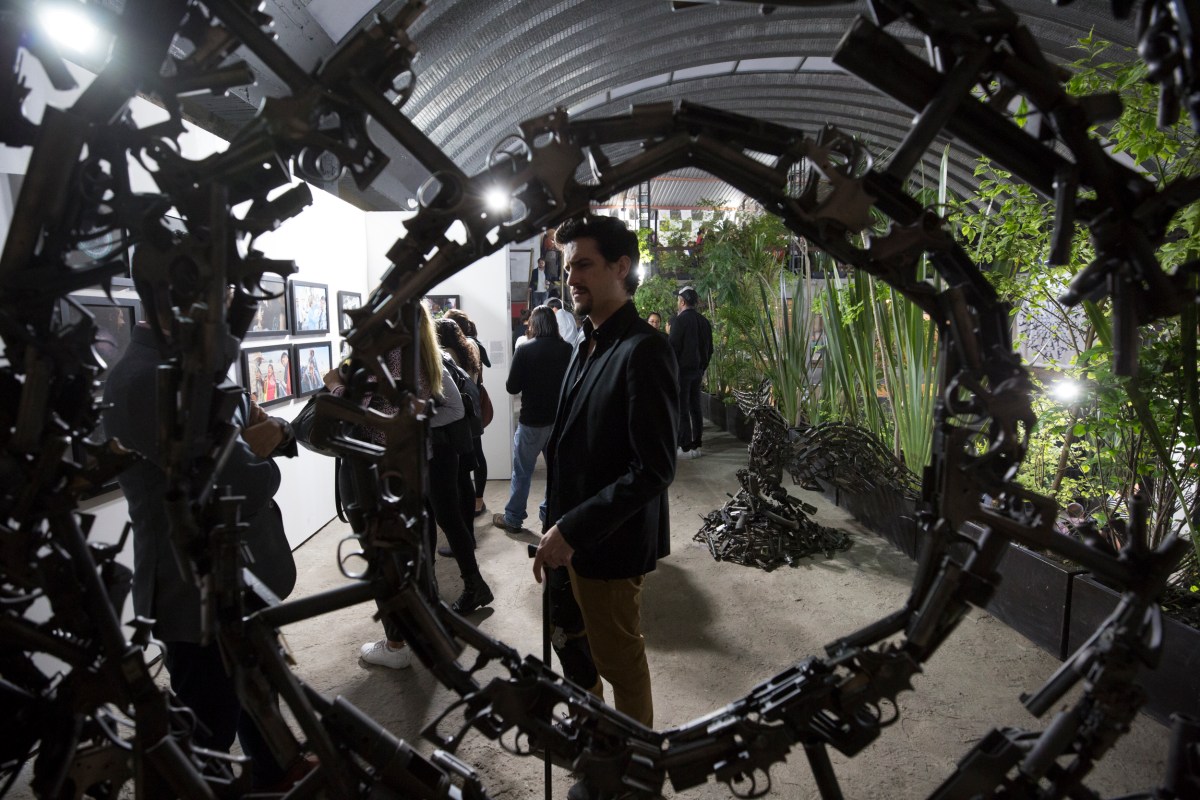 On opening night Thursday at The Museum of Drug Policy in Mexico City, visitors observe a sculpture by Alvaro Cuevas, an artist who repurposes guns that have been seized in Guadalajara into unique sculptures around the idea of reconciliation. Photo: © Janet Jarman/Redux for the Open Society Foundations