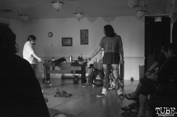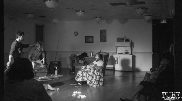 Walking into the performance space really helped me to understand the nature of the play that I was about to witness. The upstairs of the Mills Arts and Culture Center, also known as the MACC, resembled something like a banquet hall from the 1970s. Built in 1911, the building has had many incarnations including a post office, bar, gas station, fire station, restaurant, and dancehall.
