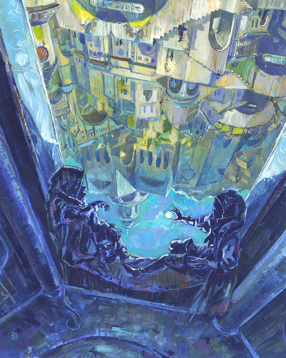 The Edotirs by Jabari Weathers. “The Edotirs is probably the most ‘fun’ and least conceptually wrought of the selection of work here. It was made for a Light Grey Art Lab show that I had the privilege to be considered for this past year. I wanted to play around with perspective and a sort of vast, weird space as it was being curated by two figures that at first seem to inhabit it. I think the idea of the moon being moved around by hand in the sky came from this old Merlin tv special with Sam Neil in the title role that I saw like…17 years ago? I dunno. The piece was a lot of fun, though!”